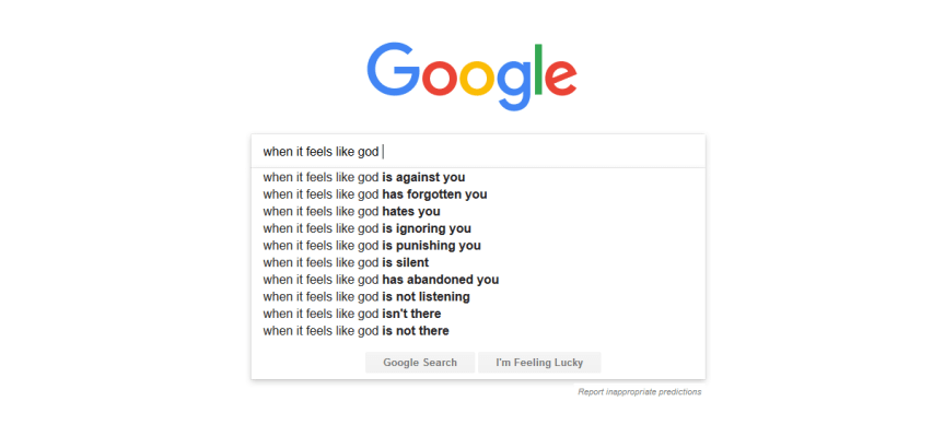 Read down that list.  Realize that, at least according to Google’s algorithms, this are cries of the heart from people searching for answers in the middle of distress.  And when you realize that, you will feel one of two ways: bewilderment, because you’ve never not felt God there, or, like me, a grim understanding because you’ve experienced something similar.